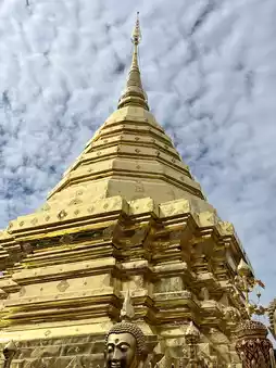 The centerpiece of the temple is its golden chedi (stupa), which shines brilliantly in the sun and houses the Buddha relic. The temple complex also features ornate shrines, bells, statues, and detailed murals that reflect traditional Lanna architecture and Buddhist symbolism.