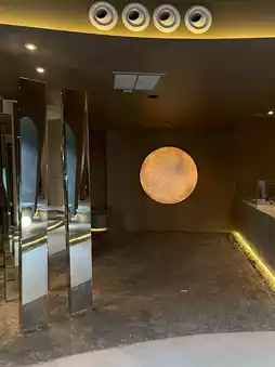 A dark black cafe designed to feel like a spaceship. There are many cool photo spots all over the shop. The interior feels cool and inviting. The background music is soft R&B.