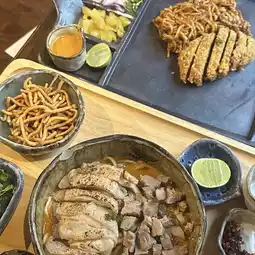 A luxurious Khao Soi dish with fresh noodles, chicken, and stewed pork. And the Khao Soi with fresh noodles and Sai Ua Katsu. The one that immediately wows you is the Sai Ua Katsu. It's so new! Crispy on the outside and soft on the inside. It's a new sensation and taste to try. 🍜🍗