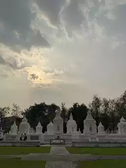 A peaceful temple in the heart of the city, featuring a large, striking golden stupa and several white stupas arranged in a serene and sacred manner. The atmosphere inside is quiet, making it perfect for relaxing, taking photos, or praying for blessings.