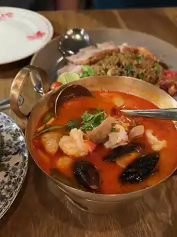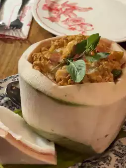 A Michelin-recommended restaurant hidden in a century-old house. A friend recommended it to me before I left. The restaurant boasts a gorgeous, retro décor. The courtyard lights create a wonderful atmosphere. It's a creative blend of traditional Thai and international cuisine, and the presentation is exquisite. The #CoconutSteamedCurry that impressed me most was a traditional Thai dish. It has a texture as smooth as a steamed egg, and it's a first for me to have curry with this texture. Served in a whole coconut, it's even more appetizing.