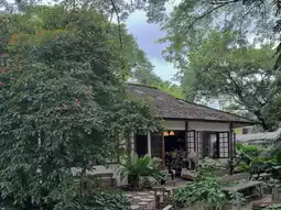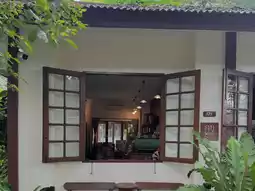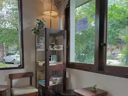 A cute Japanese-style wooden house cafe with a shady atmosphere under large trees. The lush greenery is absolutely stunning right now. The shop is decorated with warm wooden furniture. "Suk Pordee" is just as adorable as its name. If you're passing through, stop by! 💕🍃