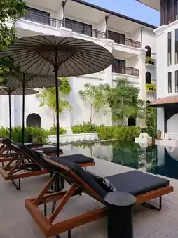 The hotel features a swimming pool in the middle of a garden. It was clean, beautifully designed, and perfect for taking photos. Nearby, there's a spa called Makkha with reasonable prices, which I used every day during my stay.
