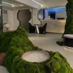 The moment you arrive, the quirky façade—a weathered wall and mysterious blacked-out glass—already hints you’re about to step into another world. Inside, the cafe channels a sci-fi fantasy with stainless steel panels, RGB-lit counters, spaceship-style seating, and intriguing rock formations reminiscent of Mars and the Grand Canyon.