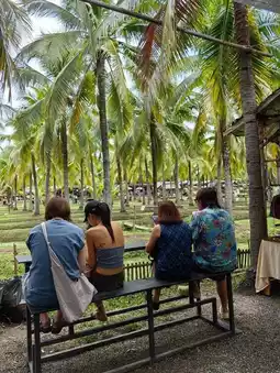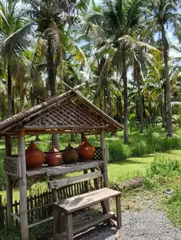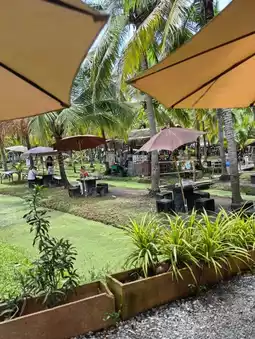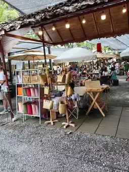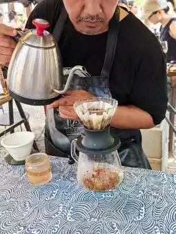 The food stalls offer a diverse selection and are reasonably priced. There are also many pour-over coffee stalls, and many people enjoy their purchases amidst the coconut trees.