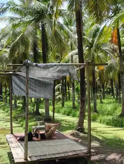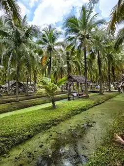 Ba Pao Flea Market, also known as the Coconut Market, is located in a coconut grove. With its vibrant coconut trees and interwoven waterways, it's dotted with bamboo bridges, pavilions, and lounge chairs, making it a perfect spot for Instagram photos. It's open only on weekends, usually from 8:00 AM to 2:00 PM on Saturdays and Sundays. It's recommended to arrive in the morning, as the stalls gradually close in the afternoon.