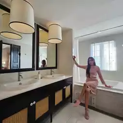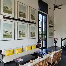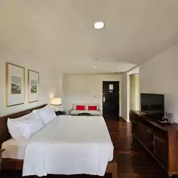 Our room is spacious, decked out in old colonial style with wood flooring, but with modern amenities, wifi, and smart TV. The bathroom is of a good size, comes with complete toiletries, and a bathtub.