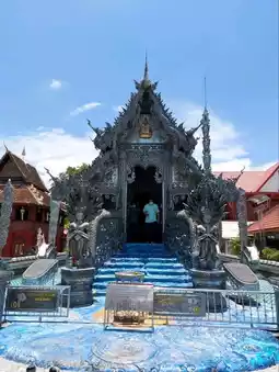 Wat Sri Suphan, an ancient temple in Chiang Mai, boasts a stunning silver chapel. The chapel is made of intricately patterned metal, with intricate relief designs and blackened areas, creating a strikingly beautiful chapel.