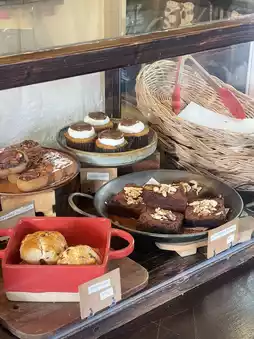 I really love the decor of the dessert counter in front of the shop. It shows the owner's dedication and care. It's full of cute little details. There aren't many tables, about 5-6. Parking is available.