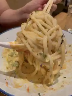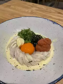 * Mentaiko Cream Udon — Udon noodles served with a rich mentaiko cream sauce. The salty, rich flavor of the fish eggs, combined with the creamy richness of the cream, creates a perfectly balanced flavor.