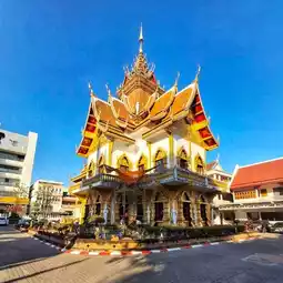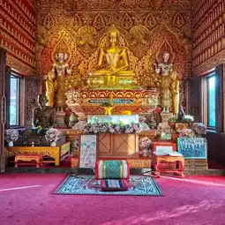 🏠The main viharn, in Lanna style, was built by King Kawilorot Suriyawong, decorated with Burmese stucco patterns. Inside, the Buddha Maha Patimakorn, in Lanna style, is cast in bronze. It is flanked by two Chiang Saen-style Buddha images, both cast in bronze, and features murals depicting the life of the Buddha.