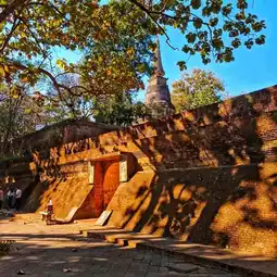 🛖 The tunnel, built during the reign of King Kuena, was used as a meditation center by Phra Maha Thera Chan, an expert in the Tripitaka. The tunnel is constructed of brick and mortar, with a layer of plaster covering the brick structure. Today, the plaster has almost completely worn off, leaving only the vaulted ceiling inside the tunnel, which features murals.
