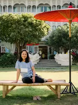 The building is designed in an antique style, giving the feeling of being in an old palace. There are plenty of photo spots. In front of the building, there’s a giant tree. Once you pass through the lobby, you’ll find a swimming pool, and as you walk further in, there’s a lawn and seating area where you can enjoy views of the Ping River.