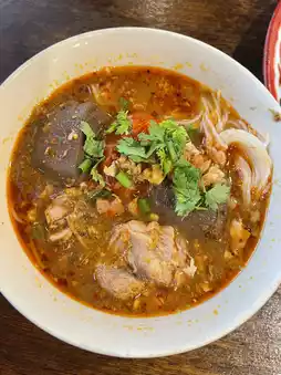• 🍛 Nam Ngiao – Rice noodles in a herbal broth, topped with minced pork and pork blood