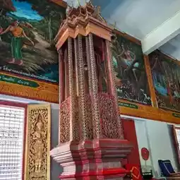 🏚 The Ho Trai (scripture hall), a four-sided pavilion, half brick, half wood structure with a surrounding gallery and large pillars supporting a wooden roof. The arched pediment features floral motifs and gilded floral vines. The naga panels feature gables, raka leaves, and swan tails, shaped like naga heads. The upper level roof features a complex of square tiers. It has a central gable-like spire.
