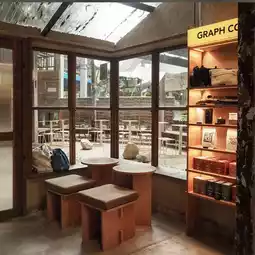 The shop is beautiful, with a mix of wood and exposed concrete, complemented by the DIY and handmade art atmosphere of the surrounding shops. It's the perfect place to enjoy a cup of coffee. The desserts are delicious and filling, and the seating is always crowded.