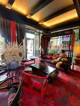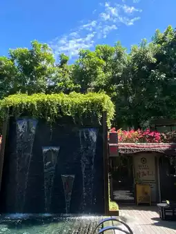 6. The decor in the common areas, such as the lobby, feels overly crowded and busy to me. The restaurant is just five meters away and has a large sign. There are many real flowers, but they are mixed with a lot of artificial ones, which detracts from the serene beauty. Every tree and space seems to have something extra hanging on it. The restaurant's lighting resembles a bar in Pattaya. However, if the walking street were open and bustling, the lively theme of the hotel might feel more fitting.