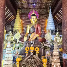 The most important religious site is the Ubosot (ordination hall), a Lanna architectural landmark. The building's distinctive features include its delicate wood carvings and stuccowork, which remain in pristine condition. Two Naga serpents slither out from the chapel walls, flanking the handrails.