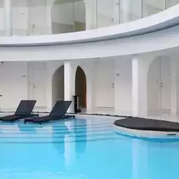 For those looking for a relaxing stay in Chiang Mai with easy access to the Nimman area, I highly recommend this place. The hotel's interior is decorated in clean white tones, emphasizing simplicity, yet offers stunning photo opportunities from every angle. The circular building features an outdoor swimming pool in the center, a vibrant blue hue that contrasts beautifully with the white of the building.