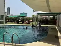 The room was very spacious, and the bathroom had a unique dark green tiled design. The pool area was very comfortable, a must-visit.