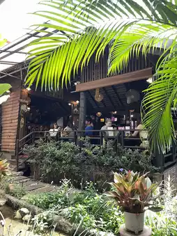 The atmosphere is amazing! 🍃 There's both seating inside the wooden house and in a small garden. 🌸 The tables aren't too crowded, and there's soft Northern Thai music playing in the background. It's incredibly cozy. 😌