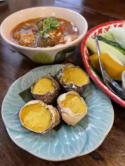 • Jin Som Mok Kai 🥚 This dish is often overlooked, but I must say it's absolutely amazing! The sour, fragrant, and creamy flavor of the eggs baked with the pork is truly amazing! 💯