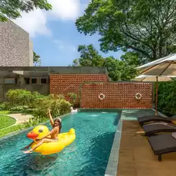 Another must-see spot when staying here is the swimming pool. It's a medium-sized outdoor pool with sunbeds by the poolside. The kids loved the variety of lifebuoys, including a flamingo lifebuoy for taking cool photos.