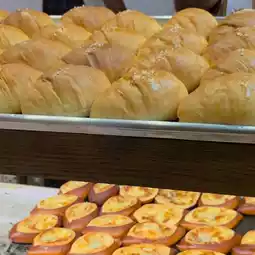 They also offer signature shiopan (salt bread) and rotating specials. The shop warms the bread before serving, using gloves. 😋🥐🧤 The shiopan has a hollowed-out bread crust, crispy on the outside and soft on the inside, with a rich buttery aroma. The egg tart has a crispy crust and a smooth custard filling. The blueberry cheesecake is smooth and creamy, made with quality ingredients. 🥧🫐✨