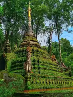 The moss pagoda is a beautiful highlight of the temple, especially during the rainy season when the pagoda is lush and lush with moss.