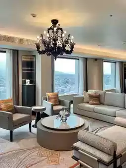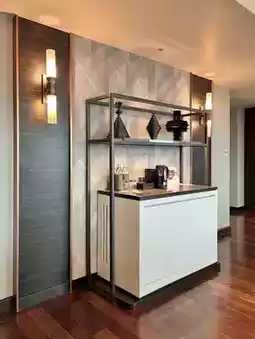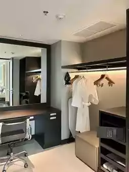 Some parts of the suite have been newly renovated to appear more modern and luxurious. Certain pieces of furniture have been replaced, while others have been refurbished to better match the room's aesthetic. However, three areas remain unrenovated: the bathroom, dressing room, and kitchen. These areas retain their original design from before the rebranding, though new appliances have been added, such as a Dyson hairdryer, which adds a premium touch.