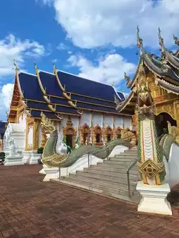 Chiang Mai, in northern Thailand, is famous for its beautiful temples, each filled with rich history and artistic detail. Many temples here feature stunning dragon (Naga) and lion (Singha) statues at their entrances, believed to guard the sacred grounds from evil spirits. The dragons, often long and colorful with intricate scales, represent strength, protection, and water—symbols of life in Thai and Buddhist culture. The lion statues, majestic and proud, stand as guardians of wisdom and power. These carvings are skillfully crafted by local artisans, showing both spiritual meaning and northern Thai art traditions. When sunlight touches the golden temple roofs and the dragon statues glimmer beside the stairs, the place feels magical and deeply peaceful. Visitors can explore, meditate, or admire how faith, legend, and artistry blend beautifully in every corner.