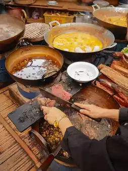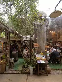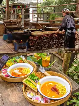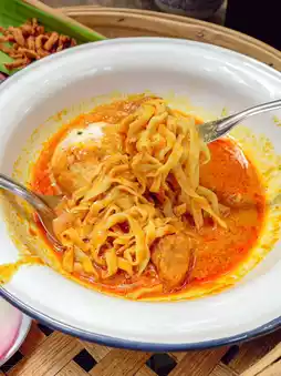 🍜 Khao Soi "Yook Samai" is a restaurant in a house next to a temple that's been open for several years. Recently, it's become a frequent sight among tourists, as they've recently started making Khao Soi. The striking feature of the storefront is the display of freshly boiled Khao Soi, ready to be boiled and the pork cooked fresh. The presentation is truly impressive, with every bowl served in a winnowing basket, arranged with garnishes on lotus leaves and bamboo cylinders. The presentation deserves a 10. If you come around lunchtime, you might have to find a seat, as it can get very crowded. Besides Khao Soi, they also offer stir-fried basil with rice, fried pork with rice, beef panang curry with rice, shrimp paste fried rice, and braised pork belly with rice.