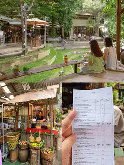 📸 Prices may be a bit high, but for tourists, this presentation is worth it. Drinks can be ordered separately at the counter. Popular favorites include passion fruit juice and Thai tea, served in stylish banana leaf cups.