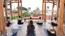 A scenic pavilion under a glass-roofed, Lanna-inspired wooden structure, offering views of Wat Chedi Luang.