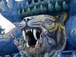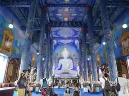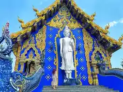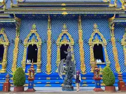 Unlike traditional Thai temples, this one is painted in vibrant shades of blue with gold accents, creating a mystical and almost surreal atmosphere.