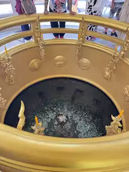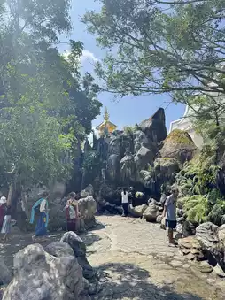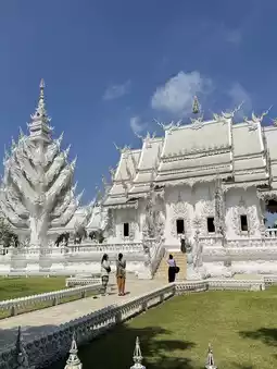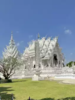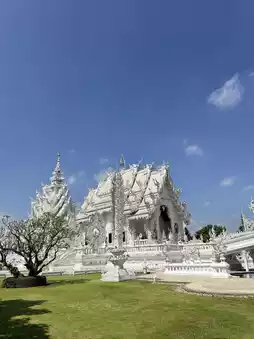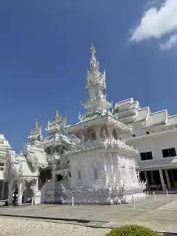 This white temple, clean and bright, showcases stunning art, both inside and out. Visitors can explore the peaceful and cool cave art. Thais are admitted free, but foreigners must pay. Wearing shorts or short skirts is prohibited. There is a shop outside that rents robes for 20 baht each with a 100 baht deposit. The interior of the temple is truly stunning. During lunchtime, various sections are locked for 1.5 hours, preventing the master's art from being displayed. Allow plenty of time to visit. The grounds are spacious, and there's ample free parking.