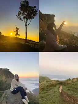 We walked a bit and were out of breath. The sunlight came out at 7.00 and we saw fog and beautiful golden mountains.