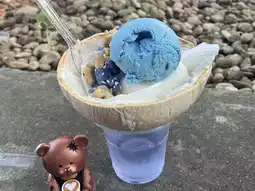After admiring the stunning architecture of the Blue Temple, don’t be in a hurry to leave! The small stall next to the temple sells butterfly pea flower ice cream, which is a local specialty. Although the blue appearance of the ice cream looks a bit strange, it is actually coconut flavored and is refreshing and delicious. There is also a cup of butterfly pea coconut juice under the ice cream, which has a unique flavor. If you find that your tongue has turned a light blue after tasting, don’t worry, just drink plenty of water and it will return to normal the next day!