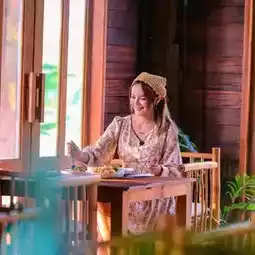 Walking into the accommodation, you will see a large rain tree, spreading its branches to provide shade. This angle is very beautiful for taking pictures. Next, you will see Café Sirin, which is the accommodation's restaurant and cafe (outsiders can also come in to eat). The cafe is also next to the stream.