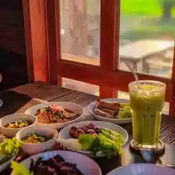 In front of the room is an organic vegetable plot with a variety of vegetables. Nearby is an egg farm. The food menu here is served farm-to-table. We can go and eat at Café Sirin. Personally, I like the taste of the food here. Every menu that I have eaten is delicious. In addition to the food menu, there are also bakery and soft-serve ice cream made from fresh milk. It is fragrant and smooth.
