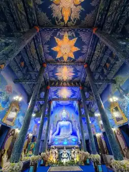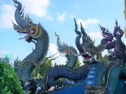 ✨️This temple stands out with its chapel that uses blue and gold. The stairs have a pair of Naga that are both strong and fierce but also graceful. The Thai architecture is adapted by the craftsmanship of Slan Nok, a local craftsman from Chiang Rai. It is beautiful both during the day and at night.