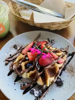 The cafe features charming decor with both indoor and outdoor seating areas. Surrounded by lush greenery, the overall atmosphere is relaxing and ideal for taking a break or snapping some photos.