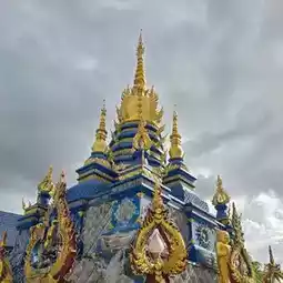 The temple was completed in 2016 and was designed by the students of Ajarn Chalermchai Khositphiphat. It has a unique blue and gold architectural style decorated with Naga serpents.