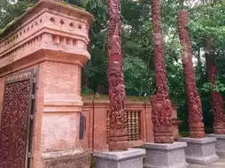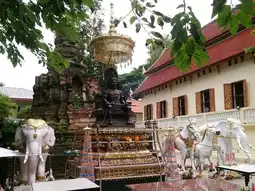 .. The pagoda of Wat Doi Ngam Muang is believed to be Phraya Mangrai's shrine. It has a laterite base (a later restoration, not built at the same time as the pagoda). It is in the shape of a castle with a 3-tiered square base, followed by a 1-tiered 2-tiered recessed base. Above it is the chedi chamber decorated with two high lotus buddha breast lines. In the middle of each side is a niche for enshrining a Buddha image. Next up is a set of two single lotus buddha breast lines in an octagonal plan, and then a round bell-shaped body. The reliquary is made of brick and has four niches. Inside is a Buddha statue.