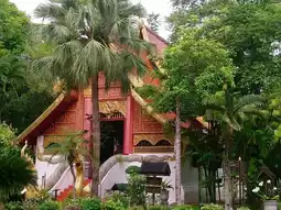 đ.. The temple's ordination hall is in the Chiang Saen style, with a low base and a low sloping roof. Inside is the principal Buddha image, Phra Chao Lan Thong.