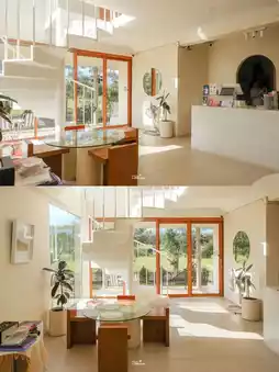 Decorated in a cozy style, focusing on wooden furniture, contrasting with white