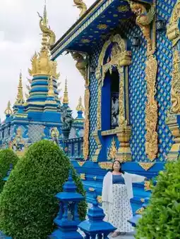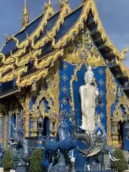 Wat Rong Suea Ten, located in Rong Suea Ten Village, Rim Kok Subdistrict, Mueang District, Chiang Rai Province, is a popular tourist destination known for its unique architectural beauty. This was created by local artist Phutta Kabkaew, or Sala Nok, a local Chiang Rai artist. He was given the opportunity to become a disciple of Ajarn Chalermchai Kositpipat during the construction of Wat Rong Khun, which led to the creation of the Rong Suea Ten Vihara. The temple is incredibly beautiful, boasting a striking, majestic blue color. #GetDiscountsWithoutLuck #BeautifulTemplesChiangRai #WatRongSueaTen