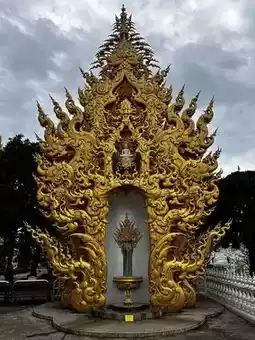 The Golden Ganesha Temple, nestled within the Wat Rong Khun (White Temple) complex, is like a dazzling bonus track 🎉. Architecturally, it's a knockout 💥, boasting golden details that pop against the White Temple's stark white backdrop. Artist Chalermchai Kositpipat's design blends traditional Thai flair with modern vibes, makin' it a visual stunner 📸. The Ganesha statue and murals inside are a colorful feast for the eyes 🎨. While it's not a must-visit solo destination, swing by if you're already at the White Temple – it's a quick, worthwhile detour 👍.