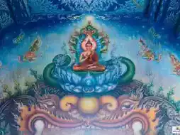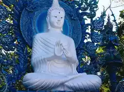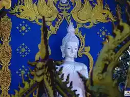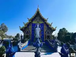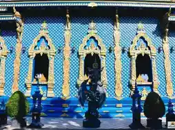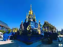 This temple stands out for its blend of contemporary and contemporary Thai architecture. Designed by artist Phutta Kabkaew, a former student of Chalermchai Kositpipat, the chapel and buildings feature bright blue tones contrasted with gold and vibrant patterns. Inside, a large statue of Phra Phuttha Ratchamongkhon Bodhi Triloknath, in the Mara-Vijaya posture, is enshrined, with exquisitely detailed decorations.