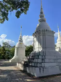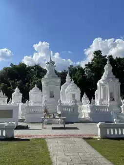 The White Temple (Wat Rong Khun), a must-visit landmark during a trip to Chiang Mai! Its dazzling white exterior captivates travelers from afar 🤍☀️. Created by Thai artist Chalermchai, this unique temple is like a masterpiece of art with its intricate carvings and ornate decorations 🎨✨.